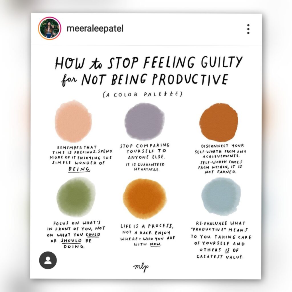 And then I also found this lovely “How to stop feeling guilty for not being productive” list by @meeraleepatel on Instagram!