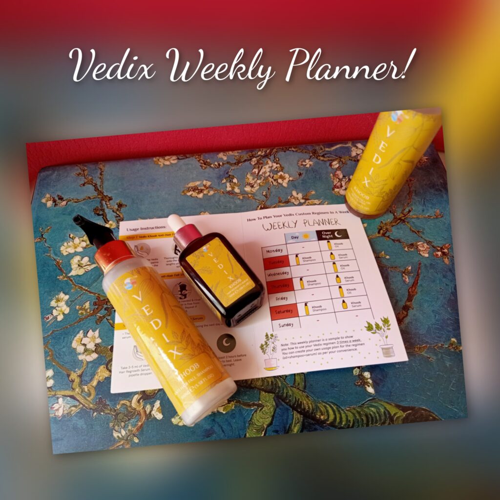 Vedix hair care box consists of three things: Shampoo, Serum & Hair Oil. It also comes with a schedule which is something like this…